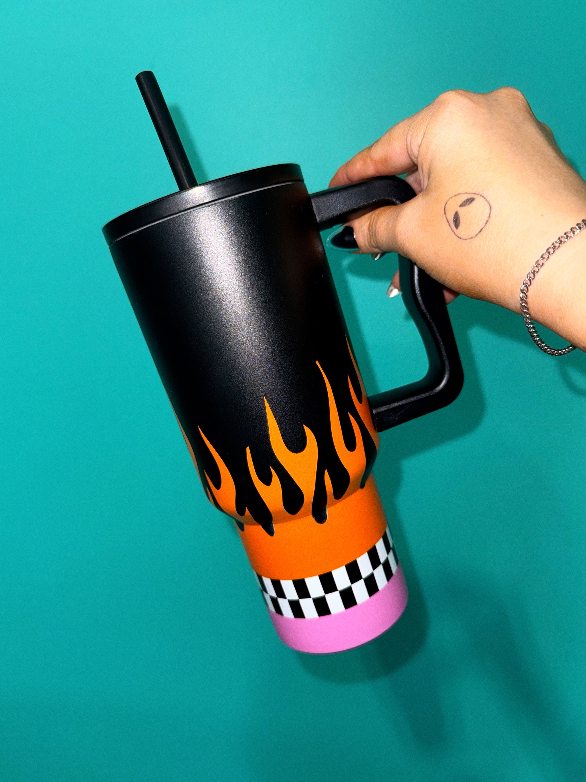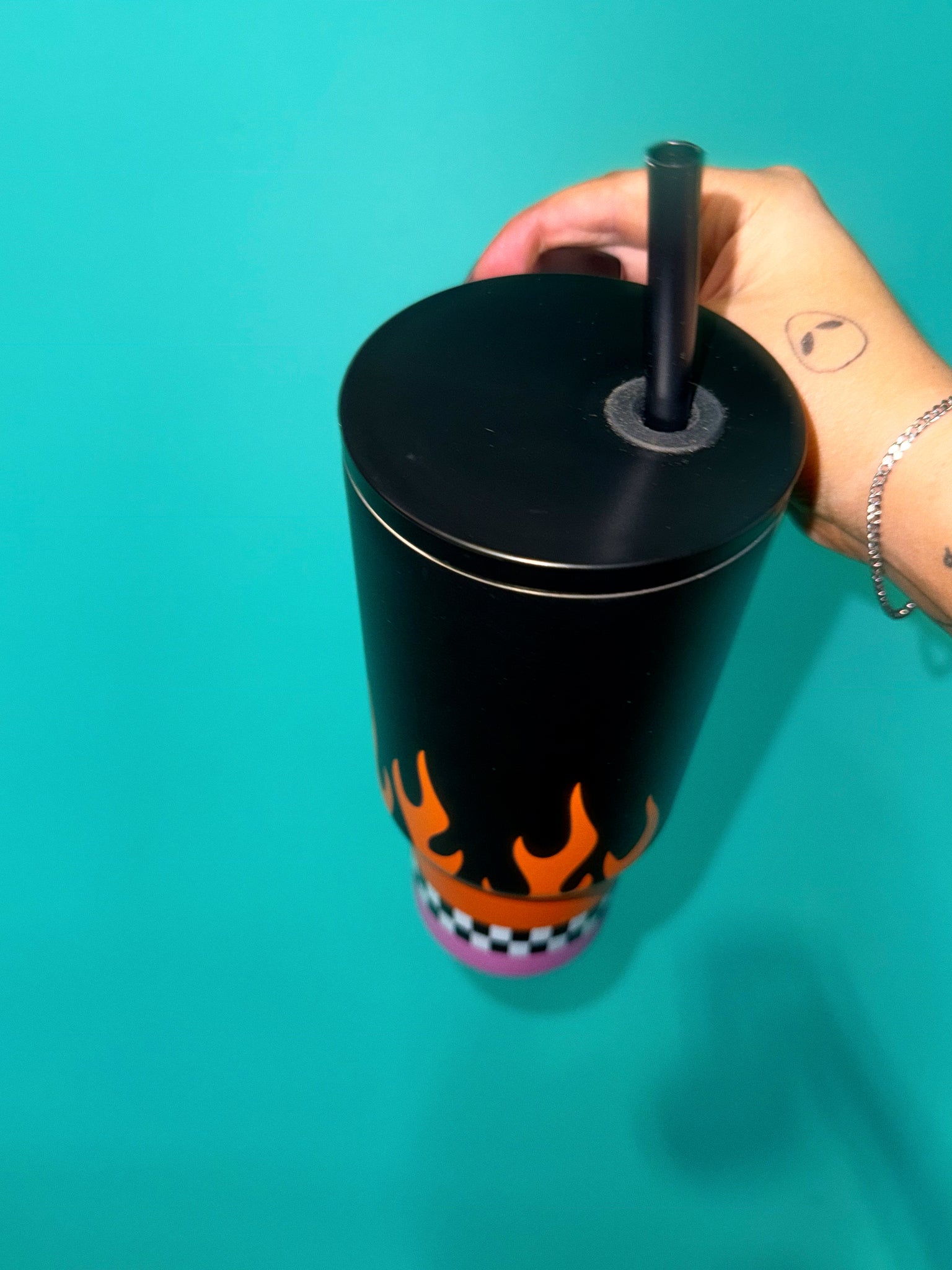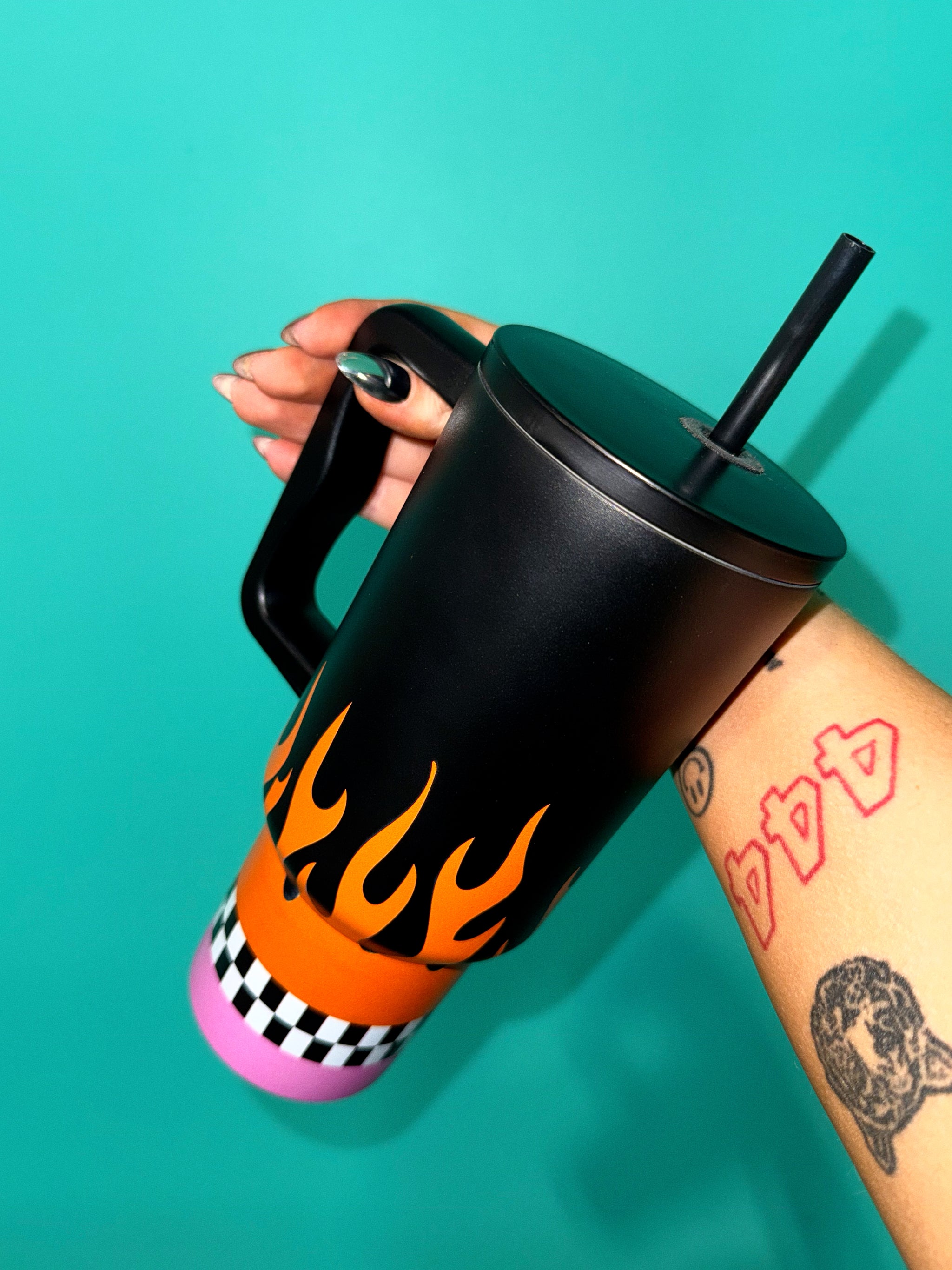 Add some edgy vibes to your daily sip with the Sk8r Girl Tumbler! Featuring bold flames, a pop of orange and pink, and classic black-and-white checkered accents, this 30oz tumbler is your new go-to for keeping drinks hot or cold in style.