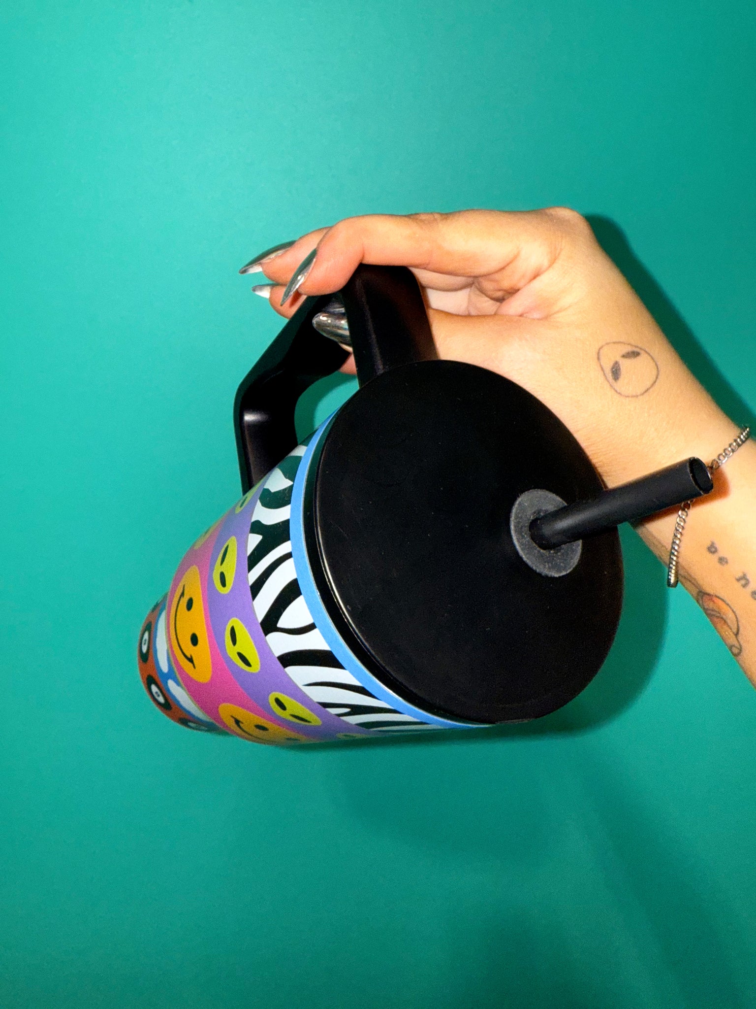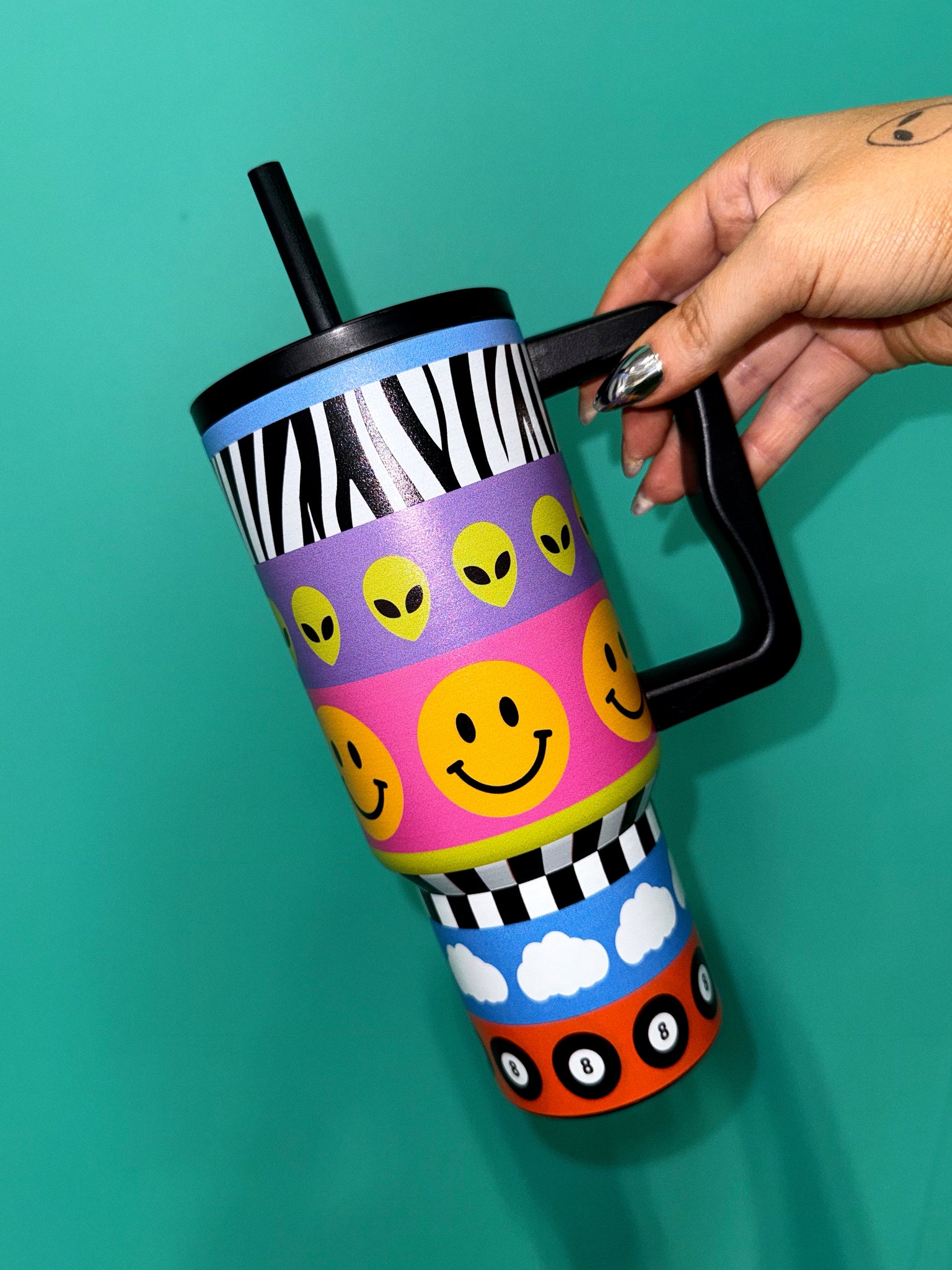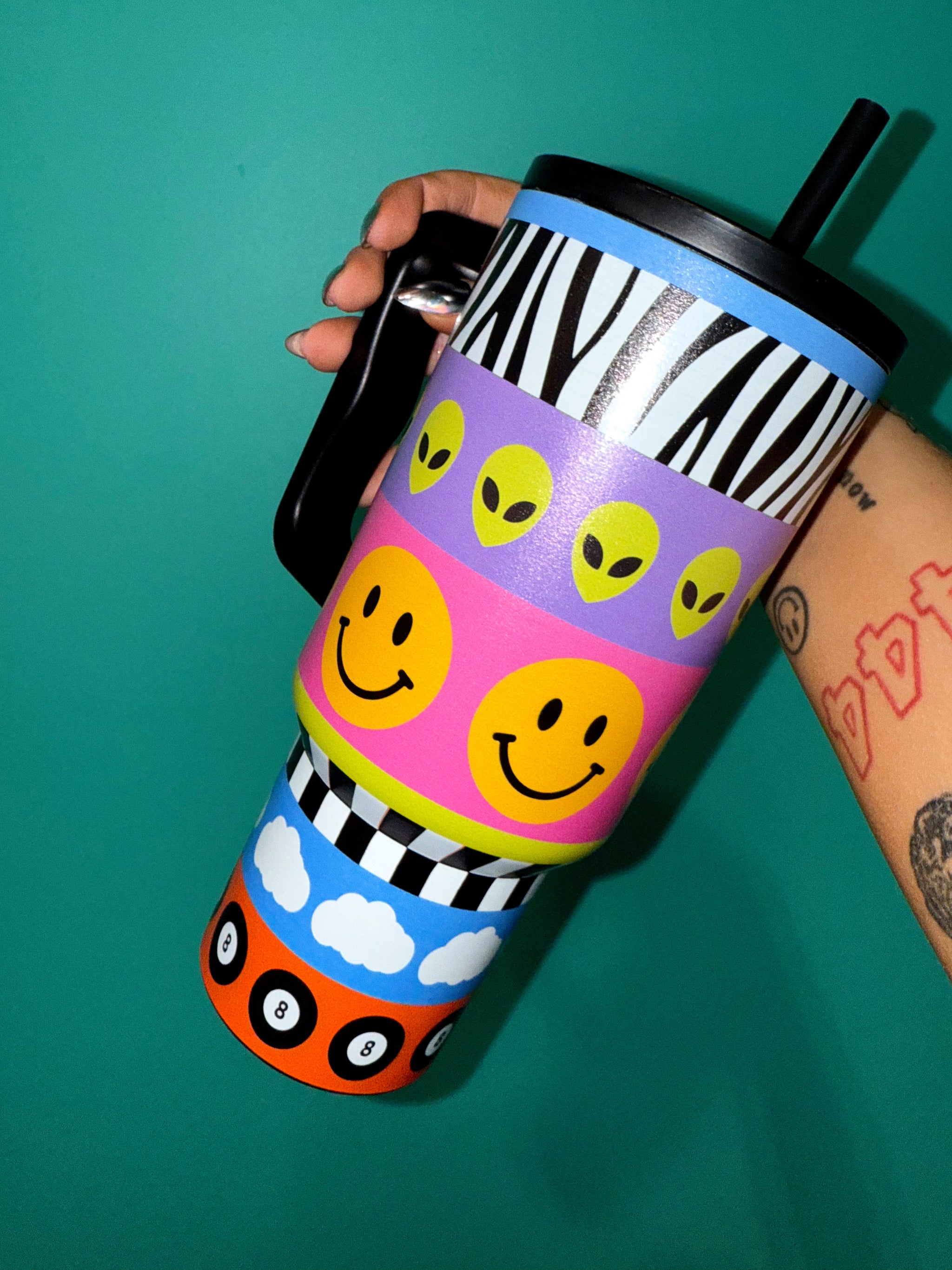 Level up your drink game with the Weirdo Tumbler! This 30oz stainless steel tumbler features a bold mix of blue, pink, and yellow, complete with checkered accents, yin-yangs, and lightning bolts for a perfectly electrifying aesthetic.