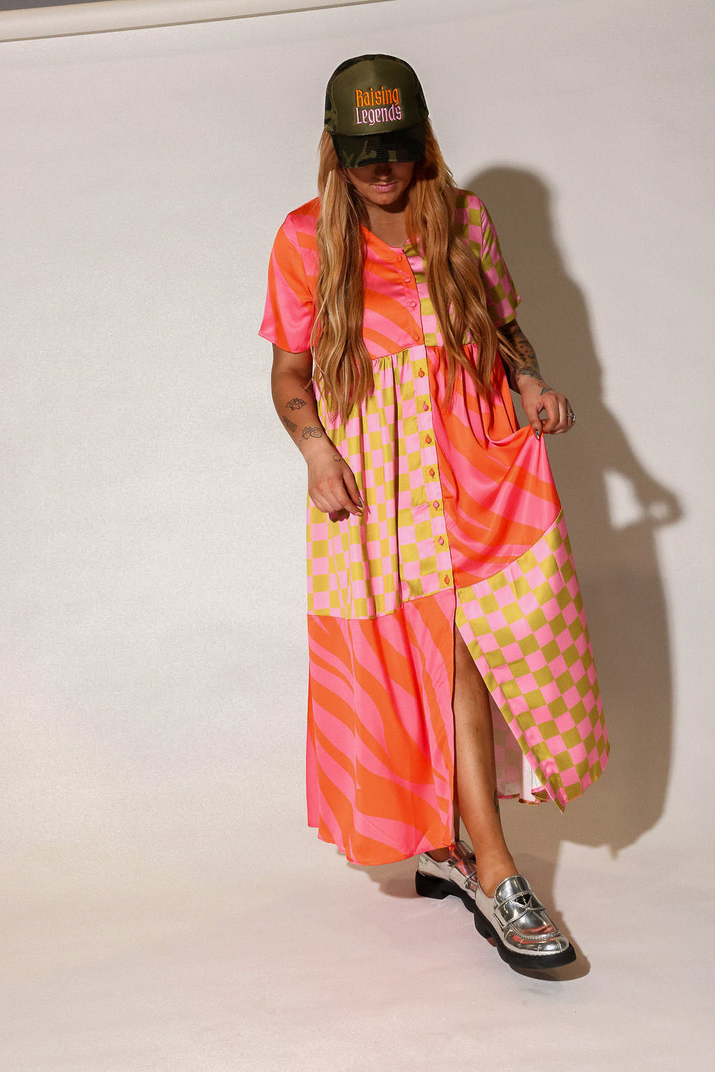 The Wild Child Dress was made for standing out. Designed by Emy, this bold mini combines a pink zebra print with lime green and hot pink checkered accents for a clash-core vibe that’s playful, daring, and impossible to ignore. She’s bold, bright, and built for main character energy.