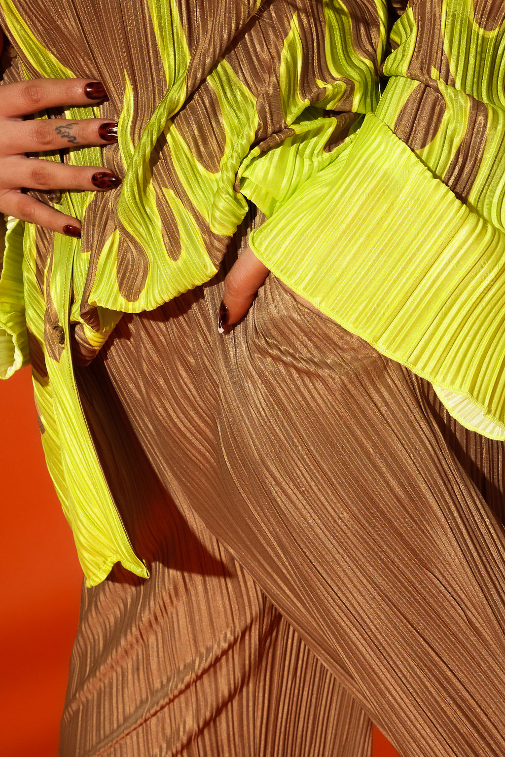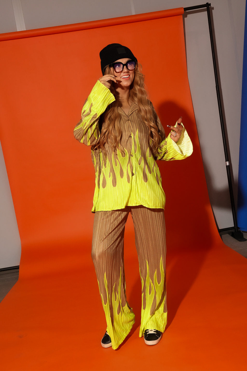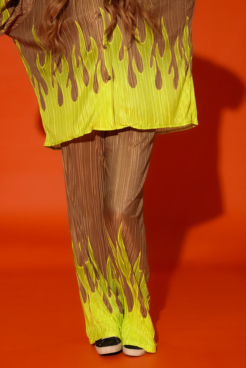 Turn up the heat. The Burn Baby Burn Plissé Set ignites with bright green flames for a look that’s bold, fluid, and impossible to forget. The button-up long sleeve top gives you endless styling options, wear it open, closed, tucked, or tied! While the matching wide-leg pants bring that effortless flow plissé is known for. Lightweight, breathable, and drama-ready… this set is your new holiday-to-night-out flex.
