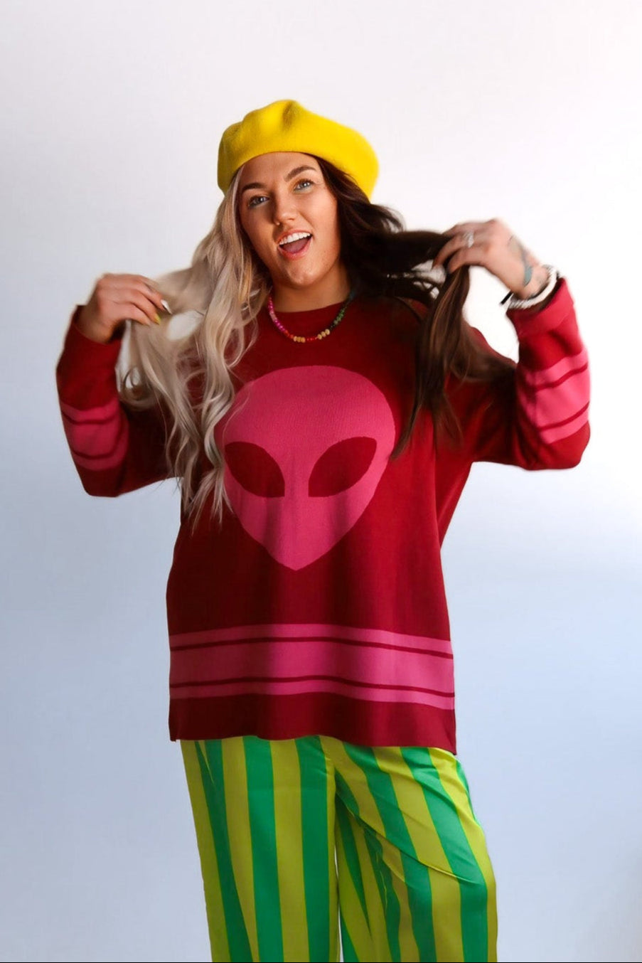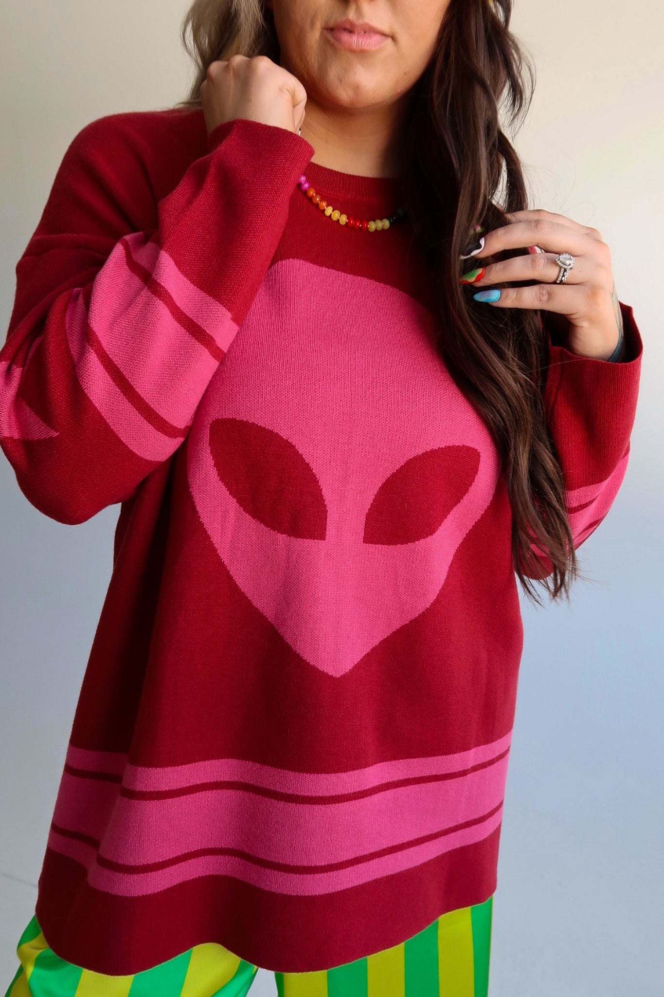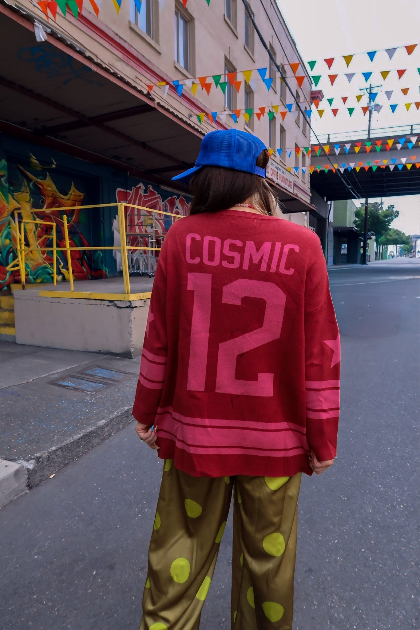 Sporty with a cosmic twist. The Cosmic Knit Jersey Sweater takes a soft pink knit and flips it into an athletic-inspired statement, finished with bold varsity lettering “COSMIC” across the front and the number “12” stamped on the back. Oversized, cozy, and cool-girl approved, it’s the kind of piece you’ll throw on with anything and instantly look styled.