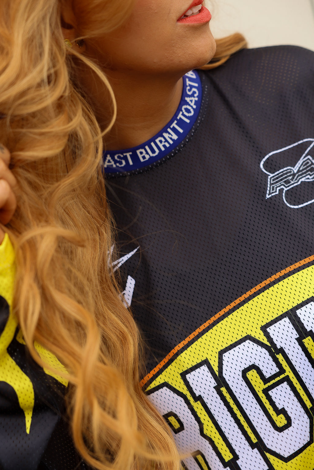 Built for speed. Worn for chaos. The Original Racing Team Long Sleeve Jersey takes classic motorsport energy and cranks it into Burnt Toast territory. Black athletic mesh keeps it breathable, oversized, and effortlessly cool, while the custom collar steals the show with “Burnt Toast” and “Original” wrapped in flames. Racing details hit the sleeves, giving you that full throttle, all-attitude moment. Perfect for styling with cargos, metallic pants, layered tops, or worn oversized as a dress. Made for the girls who show up loud.