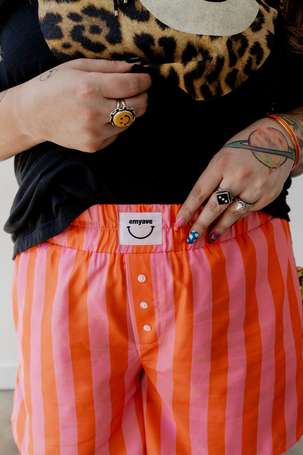 Say hiiii to your new uniform. The Sweet Tooth Boxer Shorts (an Emy Ave™ Original) aren’t your average boxers; they’re a whole vibe. With candy-striped linen fabric, a relaxed fit, and that effortless “stole these from my crush but made them cuter” energy, they’re lightweight, comfy, and made to live in. Chill at home, step out styled, or do both -- these boxers are built to be on repeat.