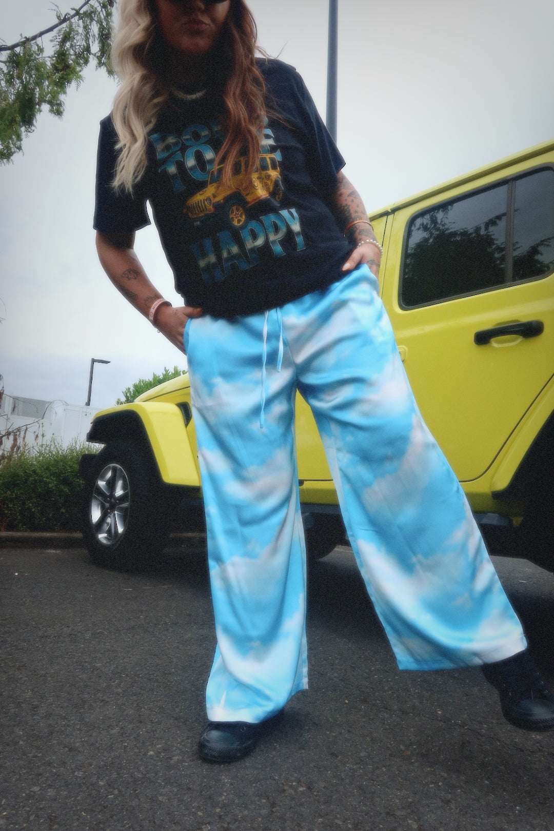 Head in the clouds, fit on the ground. The Cloud Nine Straight-Leg Pants are your easygoing uniform for laid-back days with main character energy. With a soft, slouchy fit and an allover sky-blue cloud print, these pants bring the perfect mix of cozy and bold. Finished with a drawstring waist for ultimate comfort, because the vibe is floaty, not fussy.